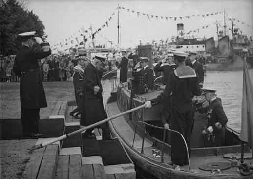 Bilden visar Hans Maj:t Konung Gustav V på väg ombord på pansarskeppet Sveriges motorbåt.Se även Kustflottan 1945 a), Kustflottan 1945 c) och Patricia 1945.